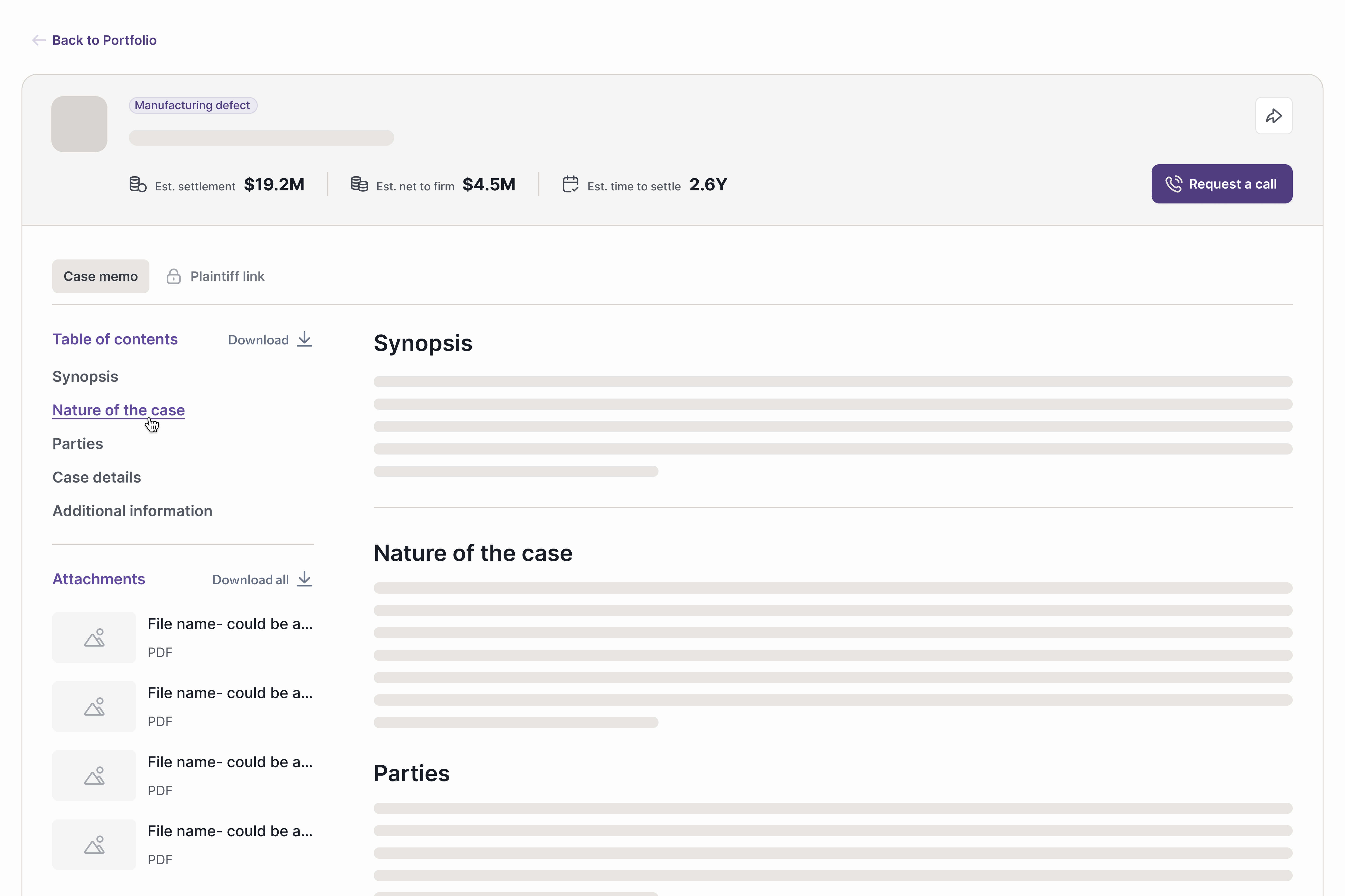 Navigate into individual matters, access case memos and supporting evidence, and manage operational workflows - plaintiff campaigns, intake, and document collection - from a single workspace.